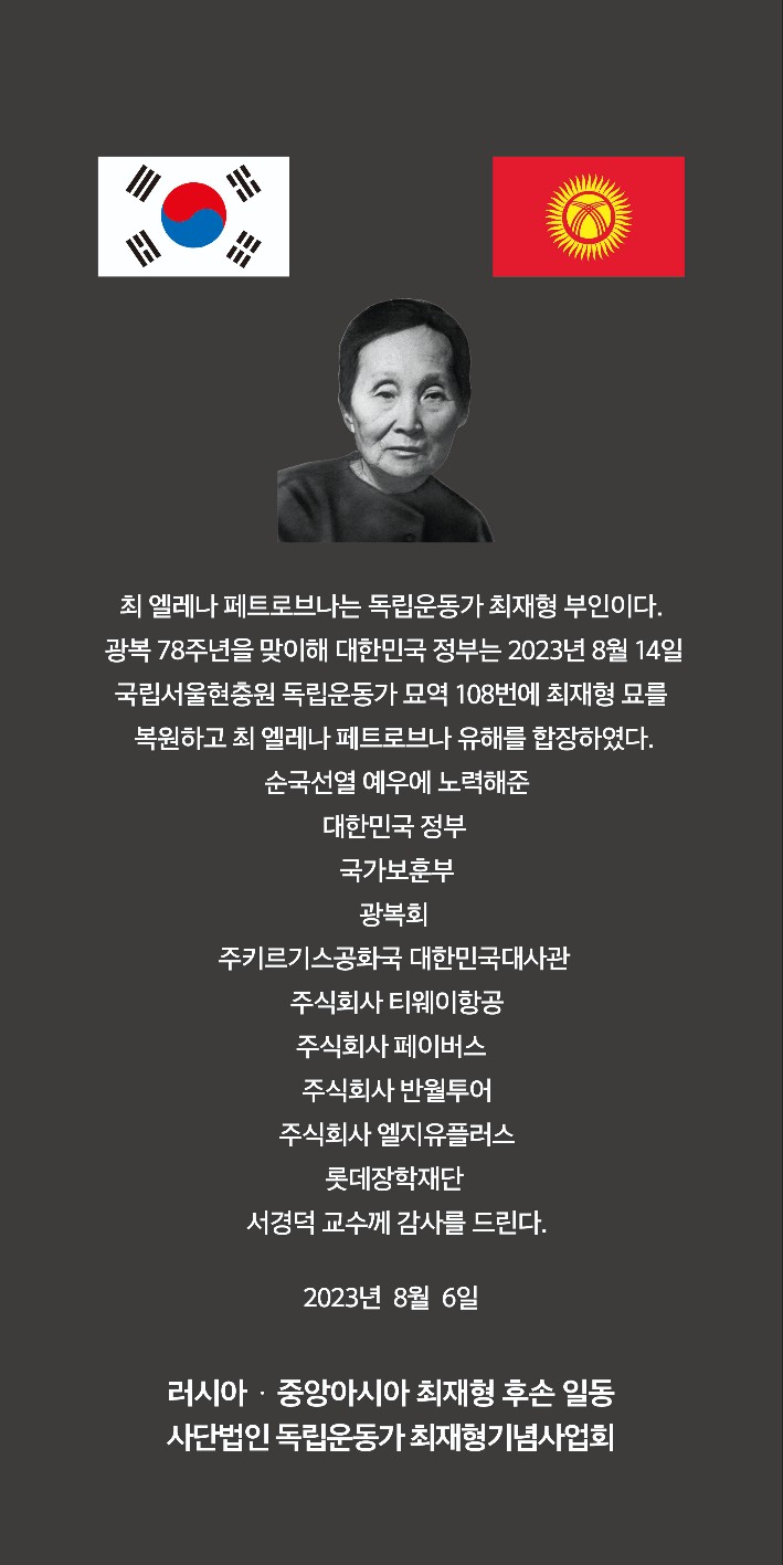 사단법인 독립운동가최재형기념사업회(이사장 문영숙)는 70여 년 동안 키르기스공화국 비슈케크 공동묘지에 방치됐던 최재형 선생의 부인 최 엘레나 페트로브나(1952년 사망) 선생 유해를 국내로 모셔와 국가보훈부와 함께 최재형 선생 163주년 탄신일인 이번 광복절에 국립서울현충원 독립운동가묘역 108번(원래 최재형의 묘터)에 합장하기로 했다고 21일 밝혔다.
