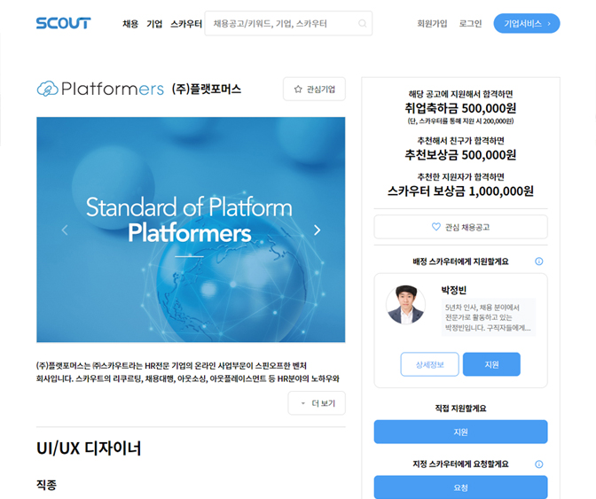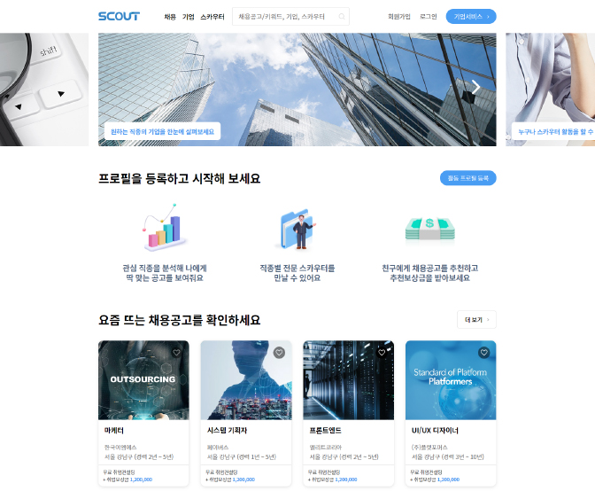 스카우트 온라인 채용플랫폼은 직무 이해도가 높은 스카우터가 구직자의 커리어를 컨설팅하고 적합한 인재를 선별하여 기업에 추천하는 스카우팅 서비스를 제공합니다.